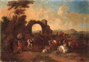 An Italianate landscape with drovers and their cattle crossing a bridge