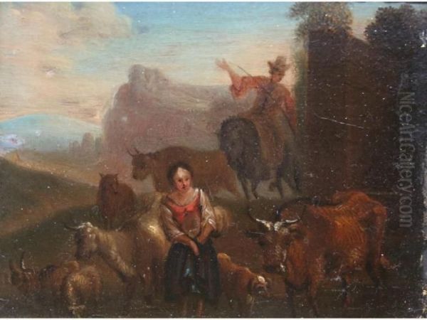 Figures With Cattle Sheep And Goats In A Landscape At Sunset