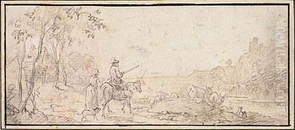Landscape With A Cowherd With His Wife And Dog Watching Cattle From A Hill