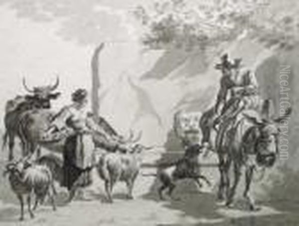 Reiter, Bauerin Und Tiere Bei Einer Tranke