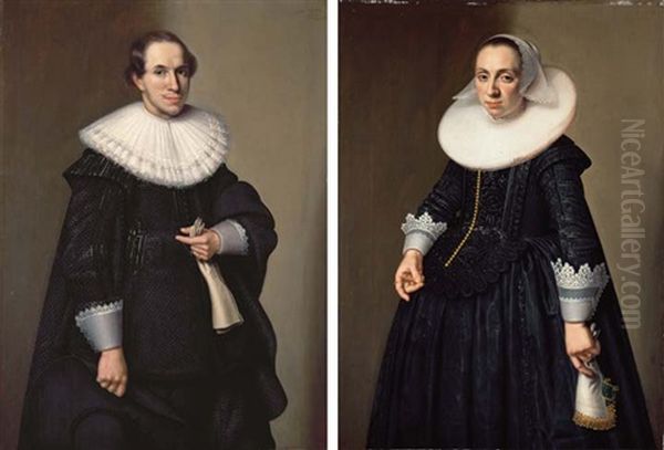 Portrait Of A Gentleman, In A Ruff Collar And Black Silk Doublet With Lace-trimmed Cuffs, (+ Portrait Of A Lady, In A Black Silk Dress With A Brocade Bodice With Gold Buttons; Pair)