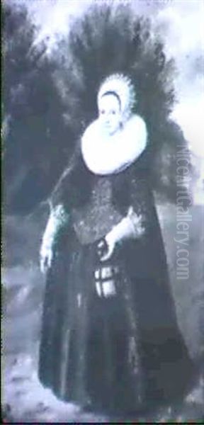 Portrait Of A Lady, Standing Small Full Length In A Black Dress With Lace Cuffs And A Ruff, On A Track