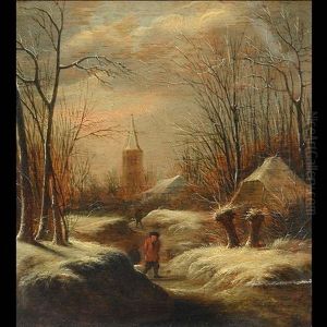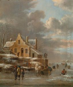 Winter Landscape With Skaters, Travellers And Their Horses Outside A Village, Figures Packing Bundles Onto A Sledge By An Archway On The Left