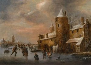A Winter Landscape With Figures On A Frozen Waterway By A Fortified Town