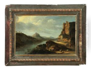 A Wooded River Landscape With Travellers Resting On A Track And Anglers On The Bank, A Village Beyond