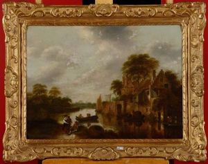 A River Landscape With Fishermen On The Left Bank And Rowing Boats And Other Figures Near A Walled Town By The Canal