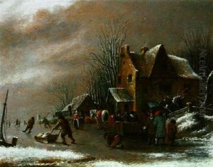 Winter Landscape With Villagers In Fromt Of An Inn, Skaters And Sledders On A Frozen River Beyond