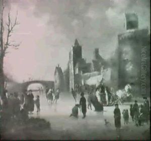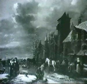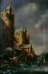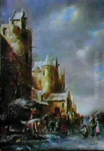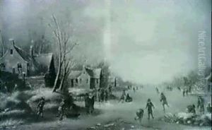Peasants Skating On A Frozen River By An Inn By A Watchtower