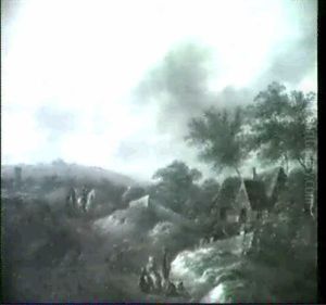 Hugellandschaft Mit Rastenden Bauern Vor Dem Gehoft Rechts, Links Auf Dem Weg Zwei Reiter