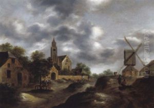 A River Landscape With Figures Fishing Near A Windmill, A Church Beyond