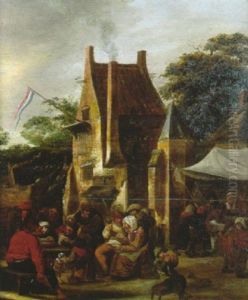 Scandinavian Landscape With Figures Outside A Tavern By A Waterfall