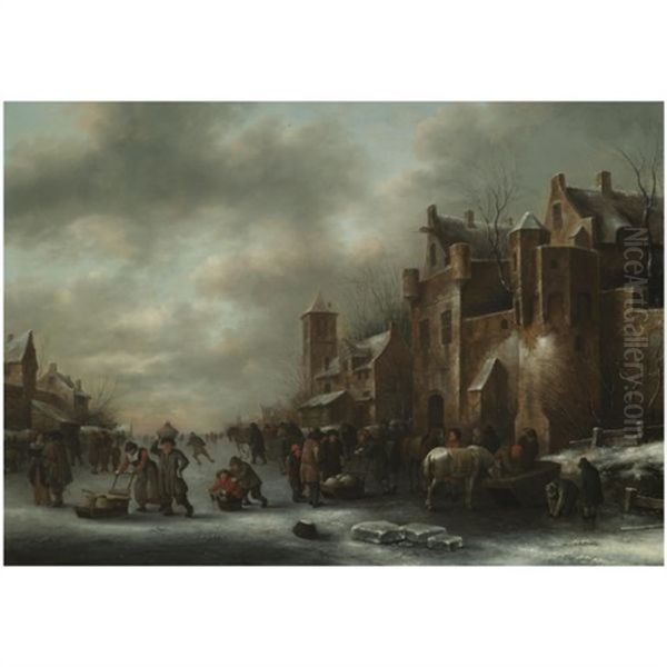 A Winter Landscape With Numerous Figures On A Frozen River Outside The Town Walls