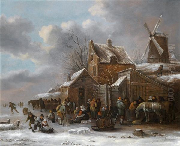 Eine Winterlandschaft Mit Dorfbewohnern Vor Einem Wirtshaus