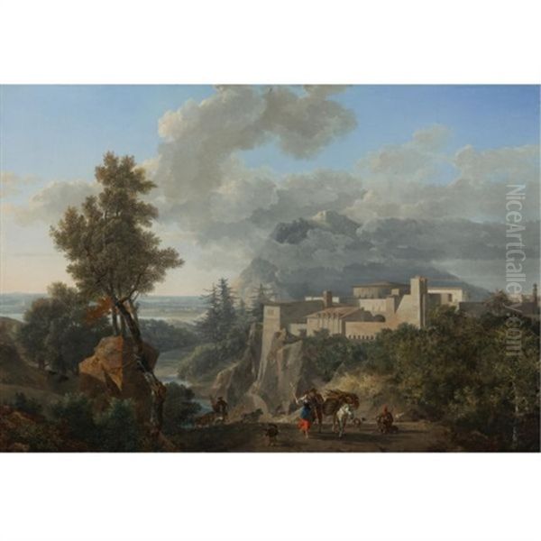 A View Near Messina, With Peasants And Animals Along A Path And A View Of A Fortified Town Beyond