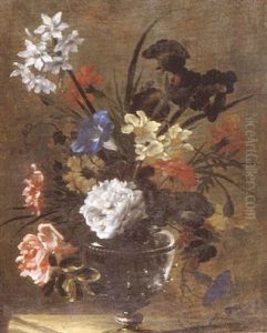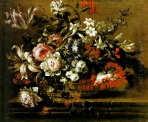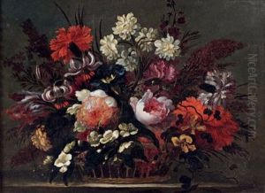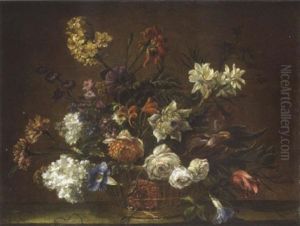 Still Life With Carnations, Tulips And Various Other Flowers In A Basket On A Stone Ledge
