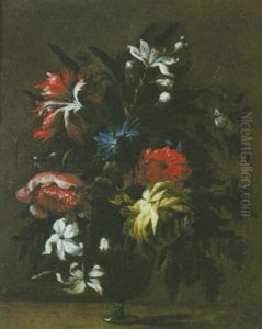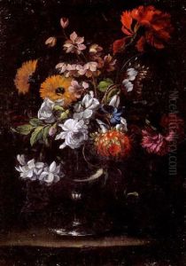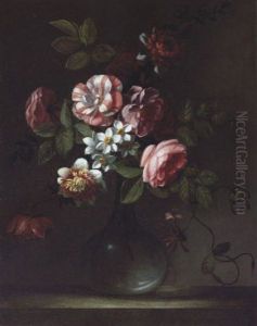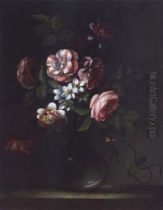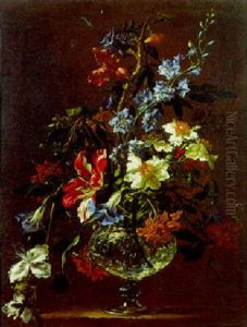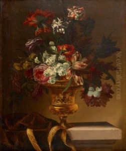 A Still Life Of Flowers In A Vase On A Ledge