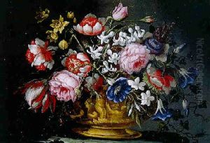 Roses, Carnations, Morning Glory And Other Flowers In A Scuplted Urn On A Ledge