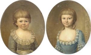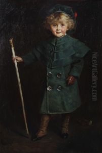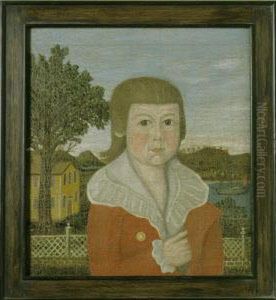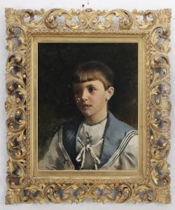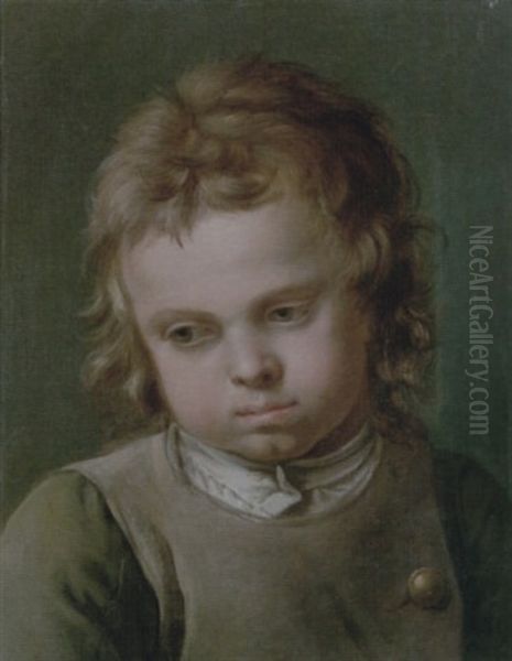 Portrait Of A Young Boy Wearing A Grey Smock And A Green Shirt