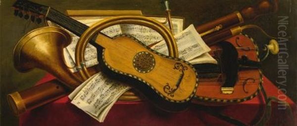 Musical Instruments And Scores On A Draped Table