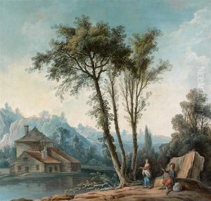 Figures Resting On The Banks Of A River, A Bridge In The Distance; Figures Resting On The Banks Of A River, A Waterfall In The Foreground