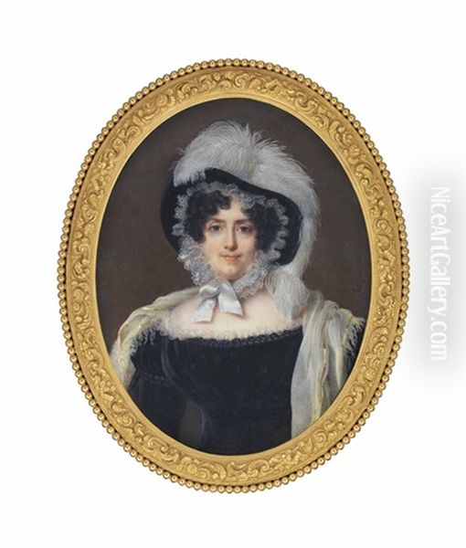 Jacquette Pauline Helene D'aure (1772-1843), Wearing Gold-trimmed White Shawl Over Black Dress, Her Black Hat Adorned With White Plumes And Tied With White Silk Ribbon Under Her Chin