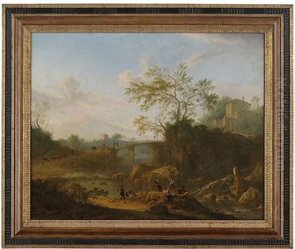 Weite Italienisierende Landschaft Mit Flussfischern Im Vordergrund Und Zahlreichen Staffagefiguren
