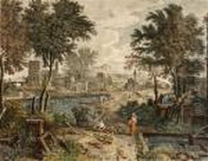 Figures With A Dog On A Path Near A Waterfall With An Extensive Landscape Beyond