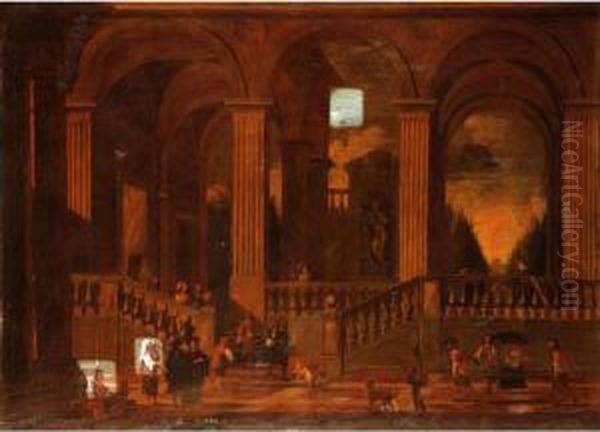 Architectural Capriccio Of The Interior Of A Palace With Elegant Company Promenading
