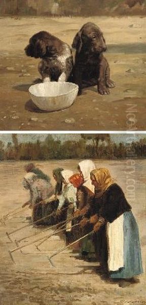 Spaniels With A Drinking Bowl; And Peasant Women Ploughing