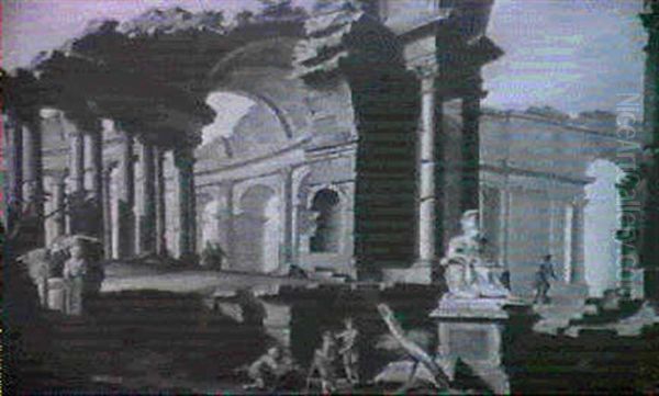 Antike Romische Ruinen Mit Einer Minerva-statue Rechts Und Verschiedenen Staffagefiguren