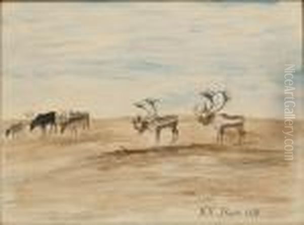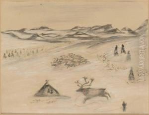 Renar Pa Fjallet Oil Painting by Nils Nilsson Skum