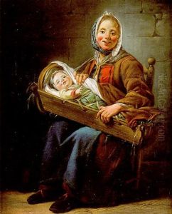 A Portrait Of A Woman, Said To Be Genevieve Lorry, Dressed As A Savoyarde, Holding A Child In A Crib, Sitting In A Courtyard, Together With A Dog
