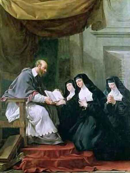 Bring the timeless beauty of Noel Halle's St Francois de Sales 1567-1622 Giving the Rule of the Visitation to St Jeanne de Chantal 1572-1641 into your home with a handmade oil painting reproduction. Carefully recreated on canvas by skilled artists using traditional techniques, this piece captures the delicate brushwork, subtle light, and vibrant color of the original masterpiece. With museum-level quality and rich texture, it brings elegance and artistic depth to any space. Enjoy free shipping and make this masterpiece a part of your personal collection.