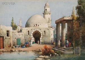A.r.c.a. Figures In A Street, A Cathedral In The Distance, Possibly York; Continental Street Scene With Figures Beside An Archway, Ancient Ruins Nearby Both Signed, Pencil And Watercolour, Each 36cm By 25.5cm