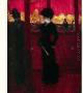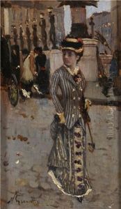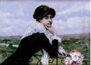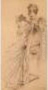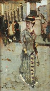 < Jeune Femme Et Commis Portant Des Fleurs >.