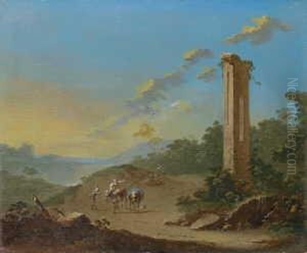 Sudliche Landschaft Mit Einer Ruine, Als Staffage Eine Maultierreiterin Und Ein Mann.
