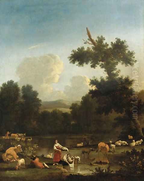 A wooded landscape with women washing clothesby a lake, with herdsmen, cattle and sheep