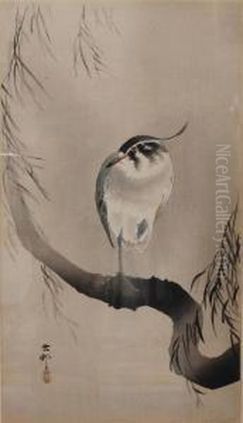 Otanzaku. Ein Reiher Steht Mit Angezogenem Bein Auf Einem Weidenast. Sign. Und Siegel "koson". Unter Glas Gerahmt.