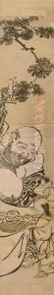 Hashira-e. Lachender Hotei Mit Zwei Kindern Unter Kieferzweigen