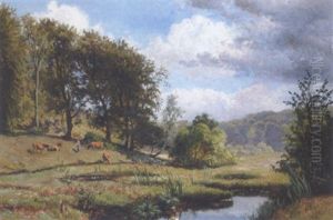 Idyllische Weidelandschaft Mit Huterkind Und Kuhen An Malerischem Teich Mit Busch- Und Baumwerk
