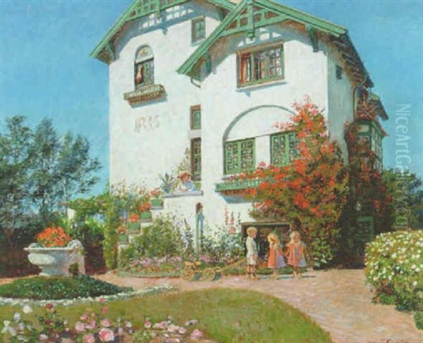 Kunstnerens Hustru Betragter Tre Legende Born I Familiens Have Ved Villa Iris Pa Vejlesovej I Holte