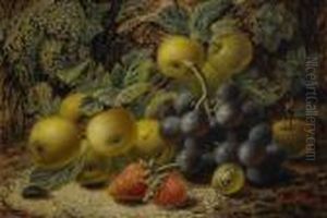 Black Grapes, Apples, White Currants Andraspberries Against A Mossy Bank