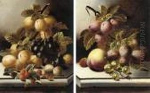 Plums, Grapes, A Peach And Raspberries On A Stone Ledge; Andgrapes, Greengages, Strawberry, Pear And Gooseberries On A Stoneledge