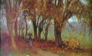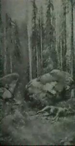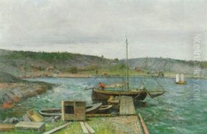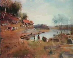 Landskap Med Byggnad Och Bjorkar Vid Vattendrag - Tidig Vinter
