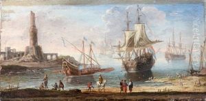 A Mediterranean Harbour With Figures Conversing And Playing Cards In The Foreground, Others Unloading Ships, And Men-of-war By A Fortress On The Docks