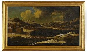 A Winter Landscape With Huntsmen And Their Dog In The Foreground