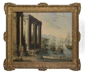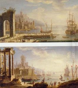 Capricci Of Mediterranean Harbours With Moored Shipping And Figures On A Quayside