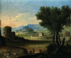 A Landscape, With Harvesters In The Foreground A Farm Beyond