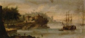 A Coastal Landscape With Figures Gathered Beneath A Castle On A Rocky Outcrop, Shipping In A Still Breeze Offshore