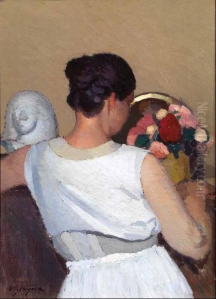 Interno Con Donna Di Spalle, Mazzo Di Fiori E Scultura